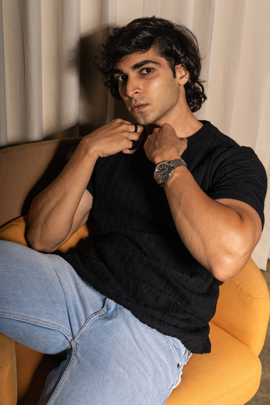 Rib knit crew neck half sleeve tshirt in Black