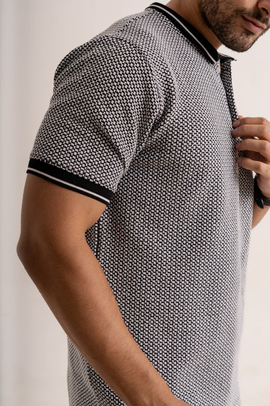 Micro two tone checkered board pattern polo neck half sleeve tshirt in black
