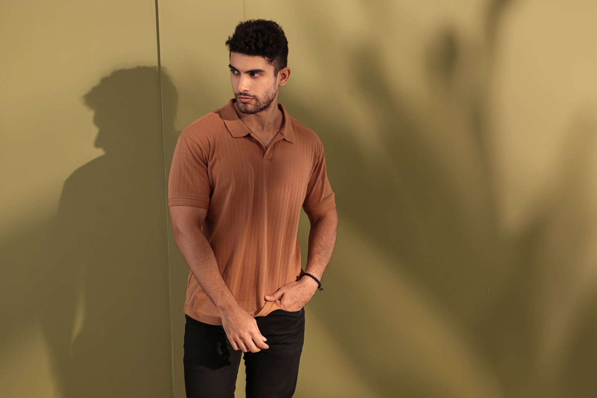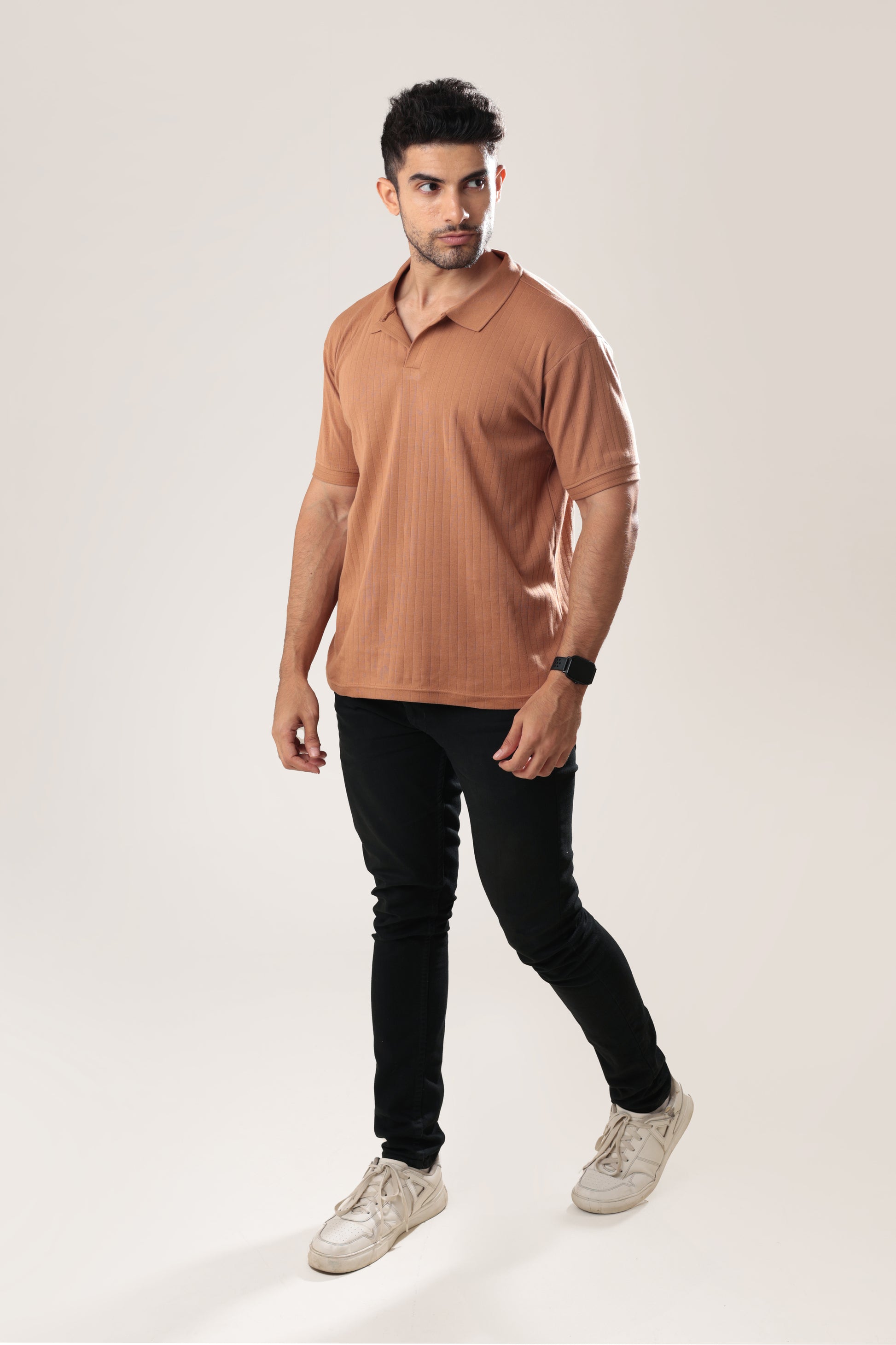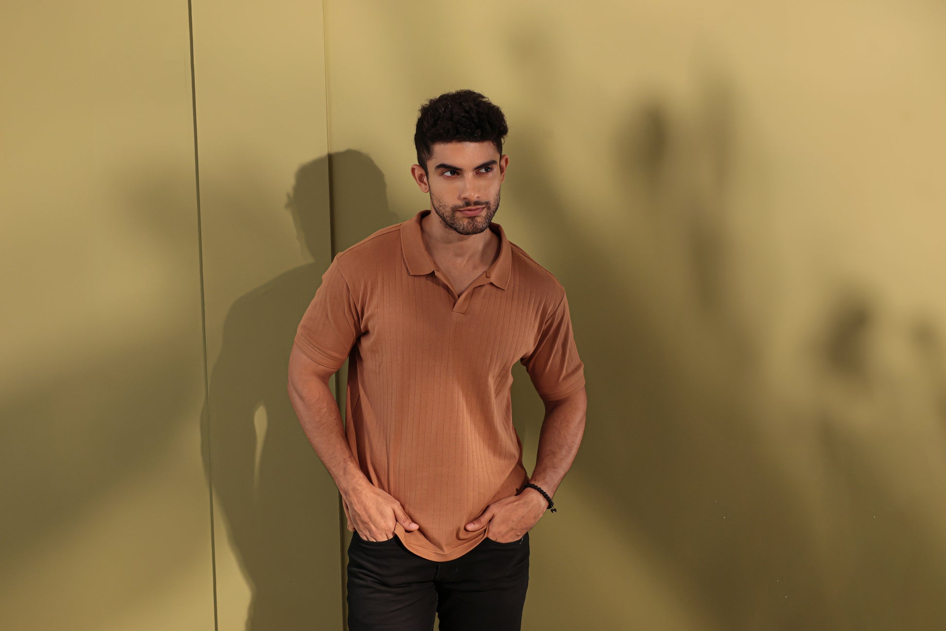 Ribbed textured Polo Tshirt - Tan brown - Half sleeve