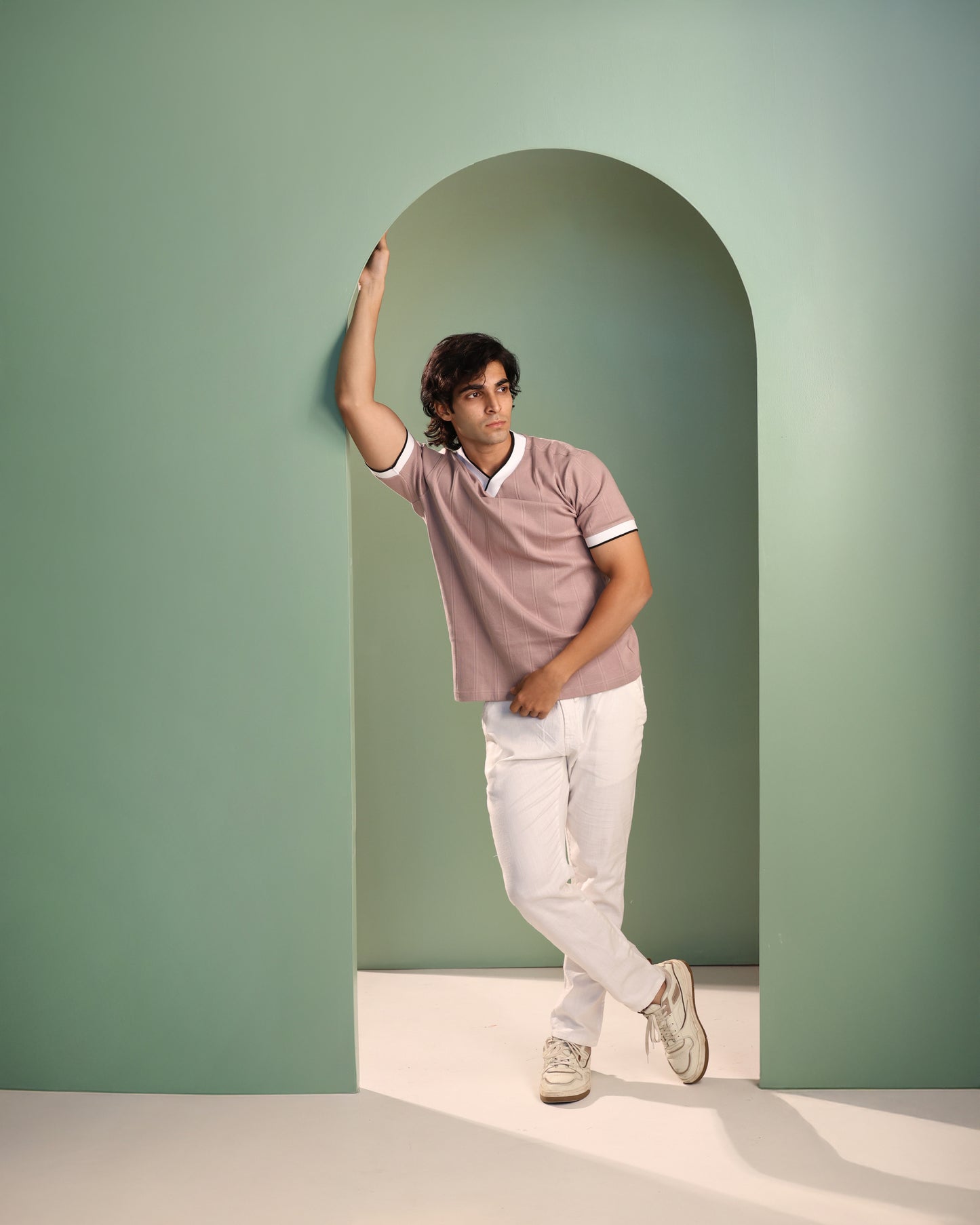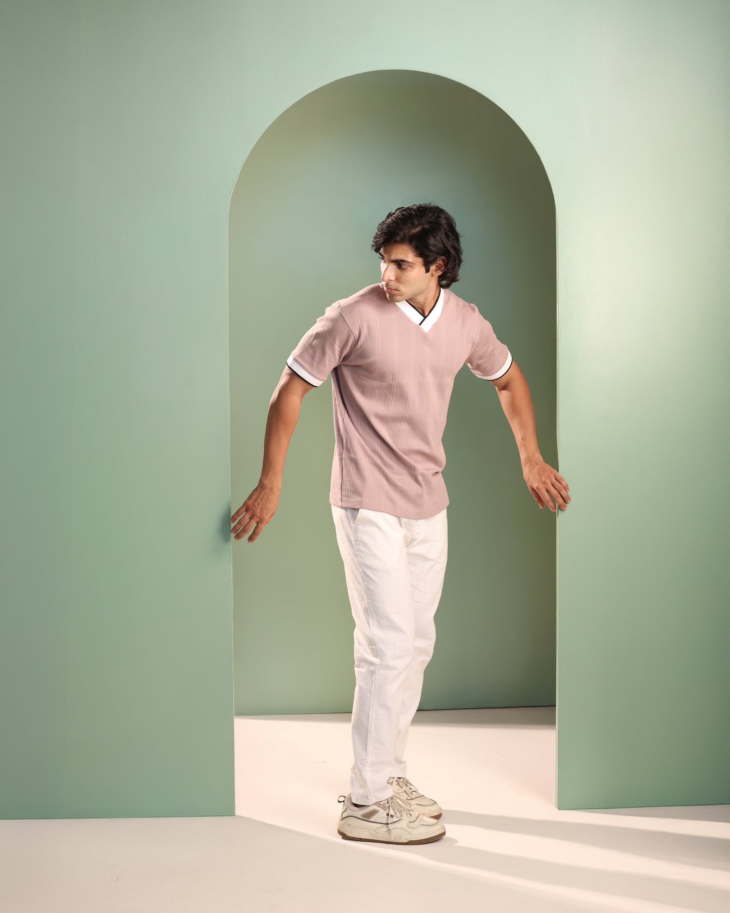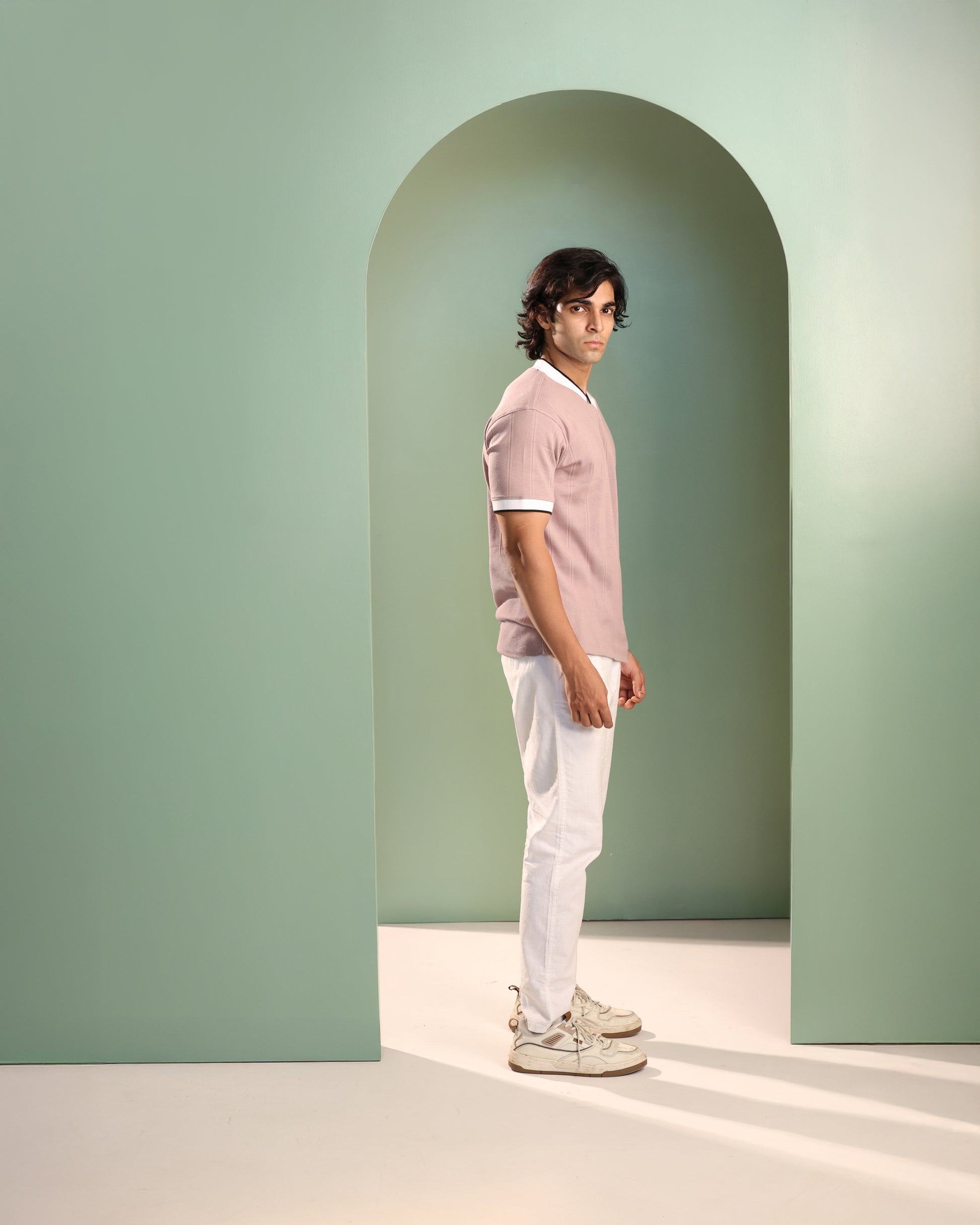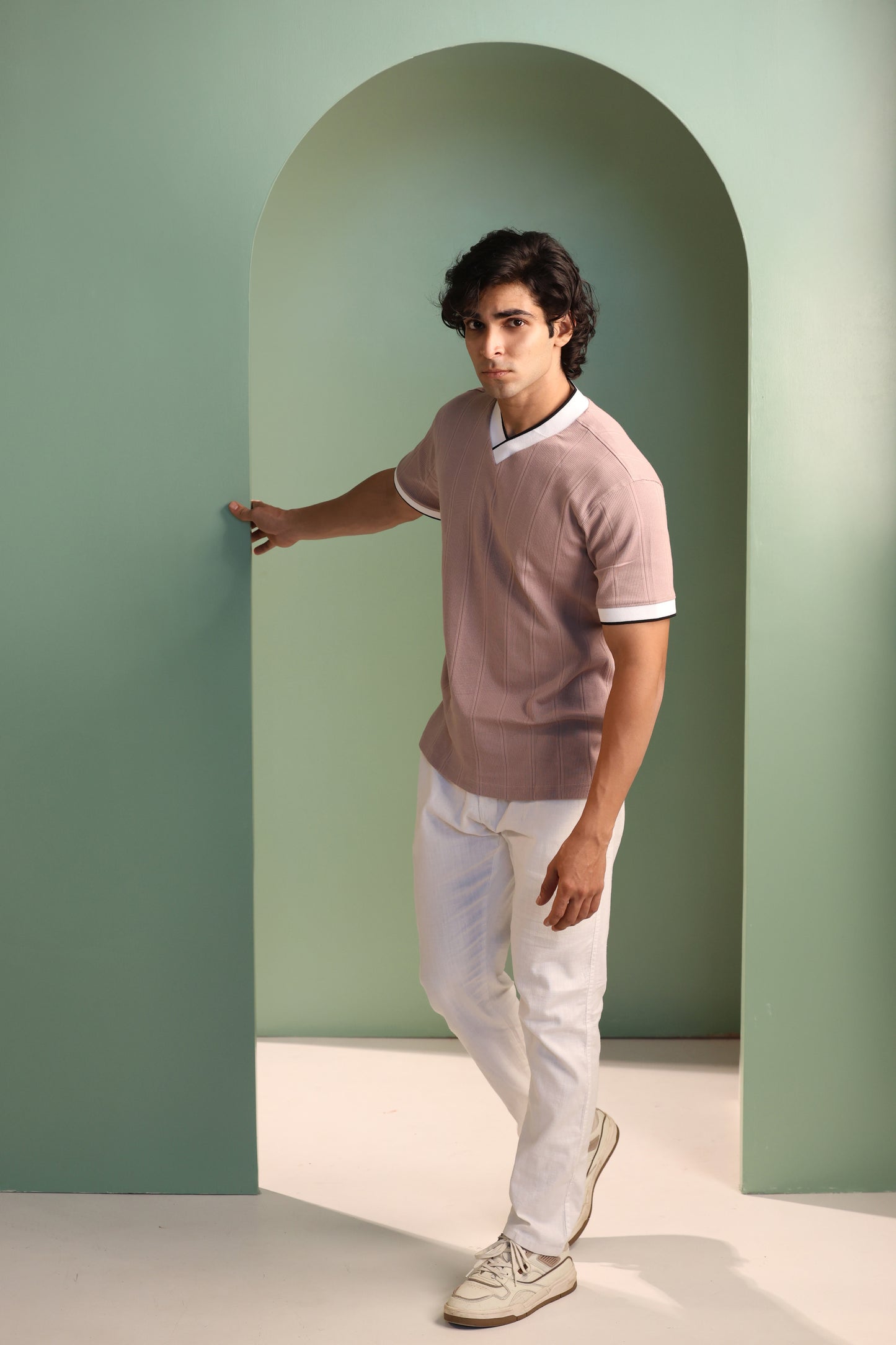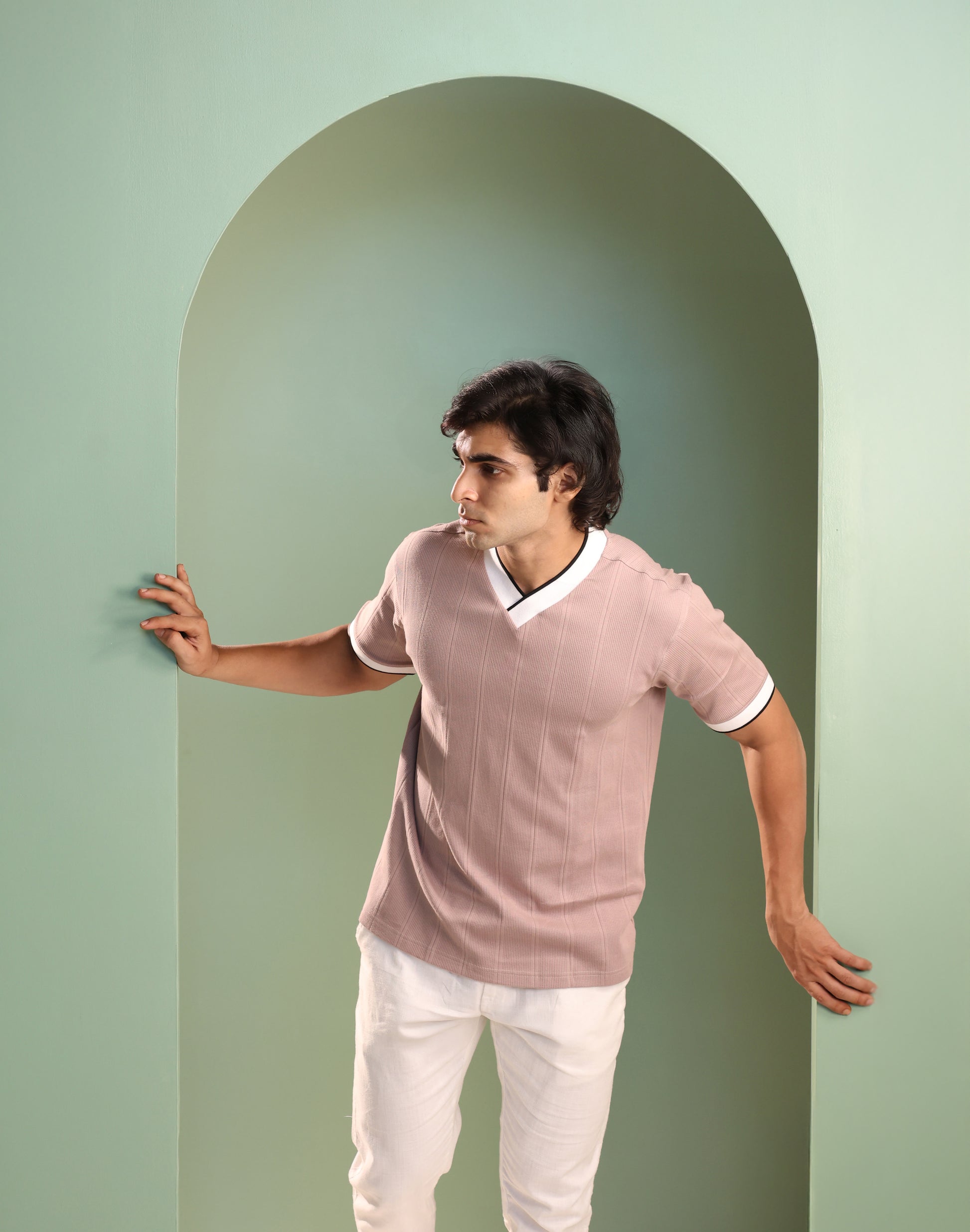 Indulge in luxury with our Contrast Piping Tee in Peach. Made with breathable jacquard knit fabric, this tee is not just stylish but also comfortable. The V neck detail in white adds a touch of sophistication. Experience the best of fashion and comfort with this exclusive piece.