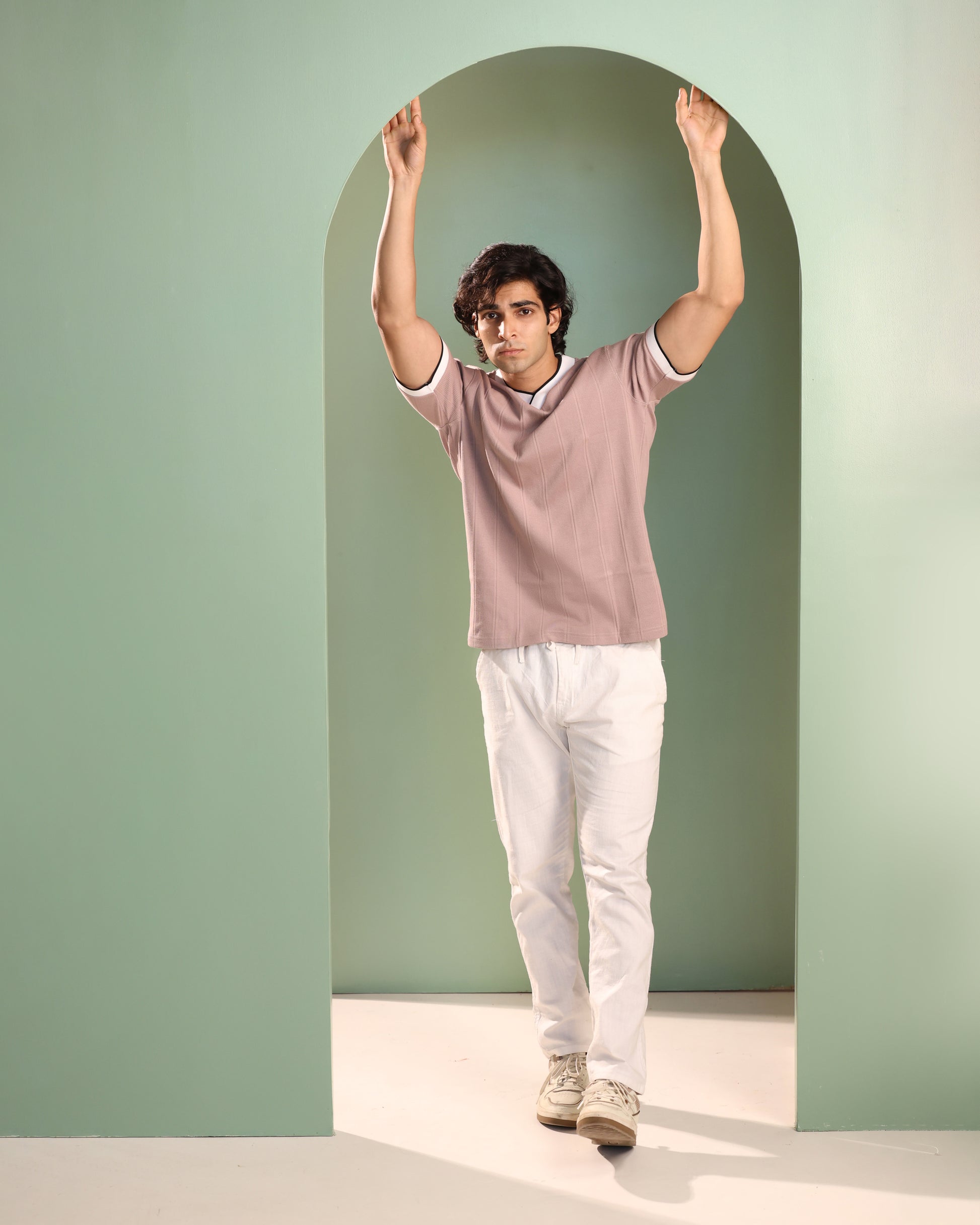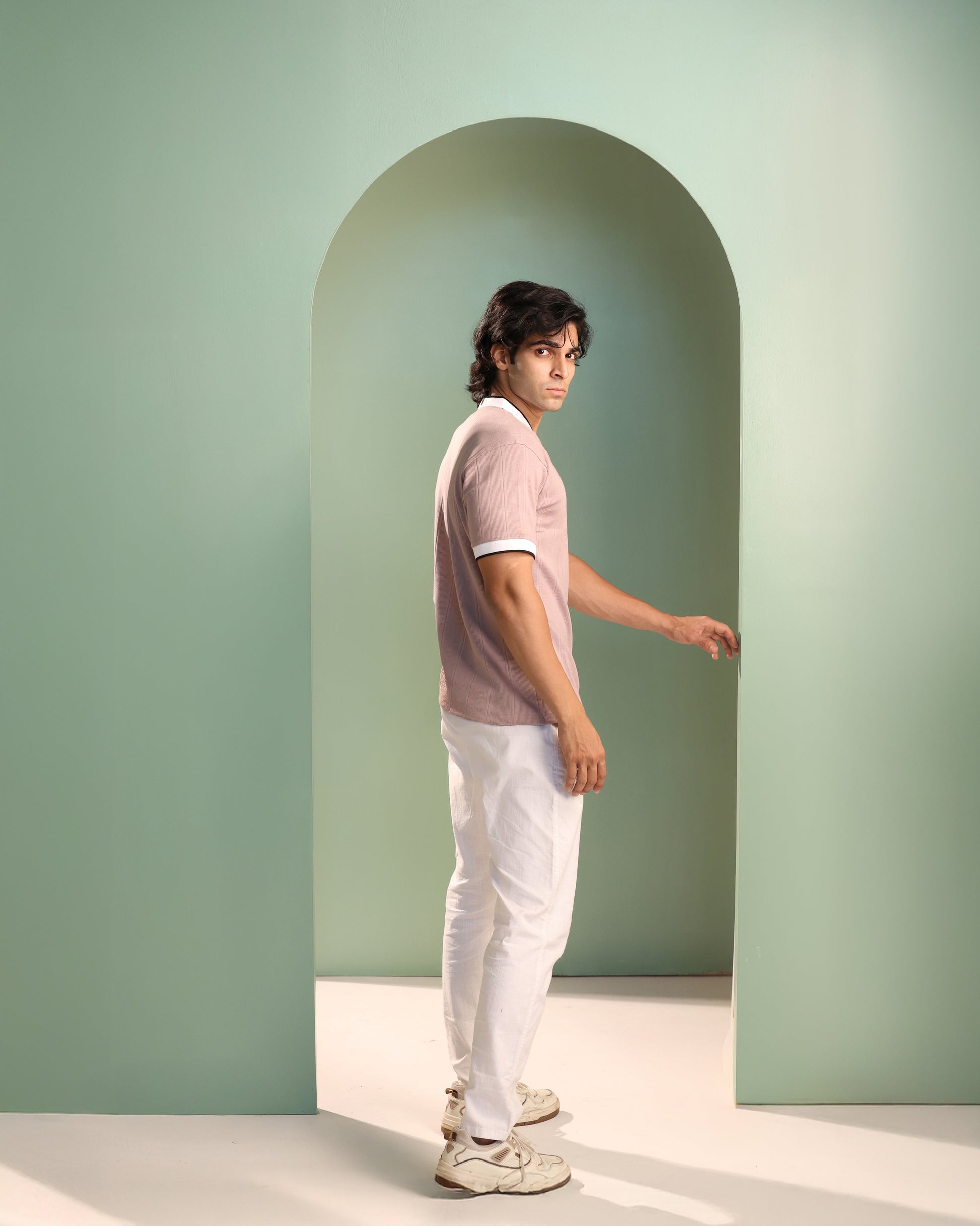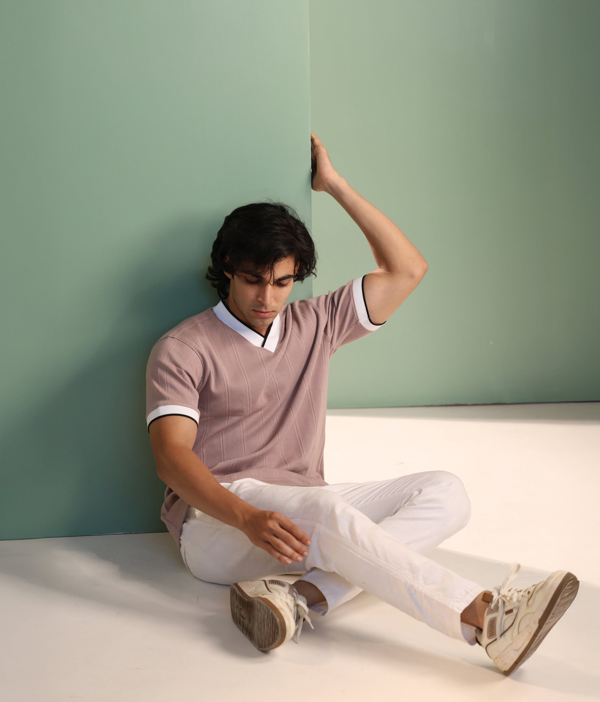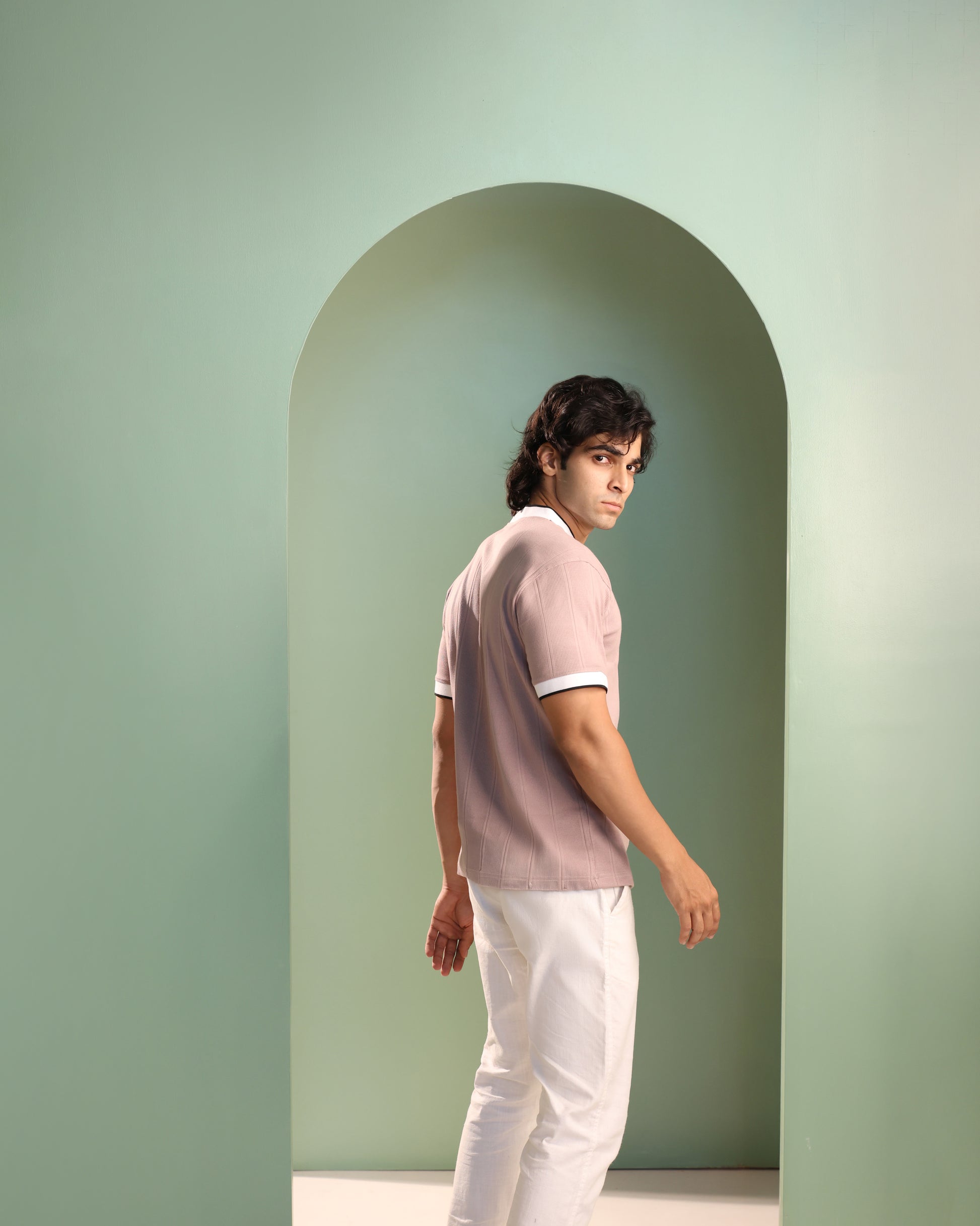 Indulge in luxury with our Contrast Piping Tee in Peach. Made with breathable jacquard knit fabric, this tee is not just stylish but also comfortable. The V neck detail in white adds a touch of sophistication. Experience the best of fashion and comfort with this exclusive piece.