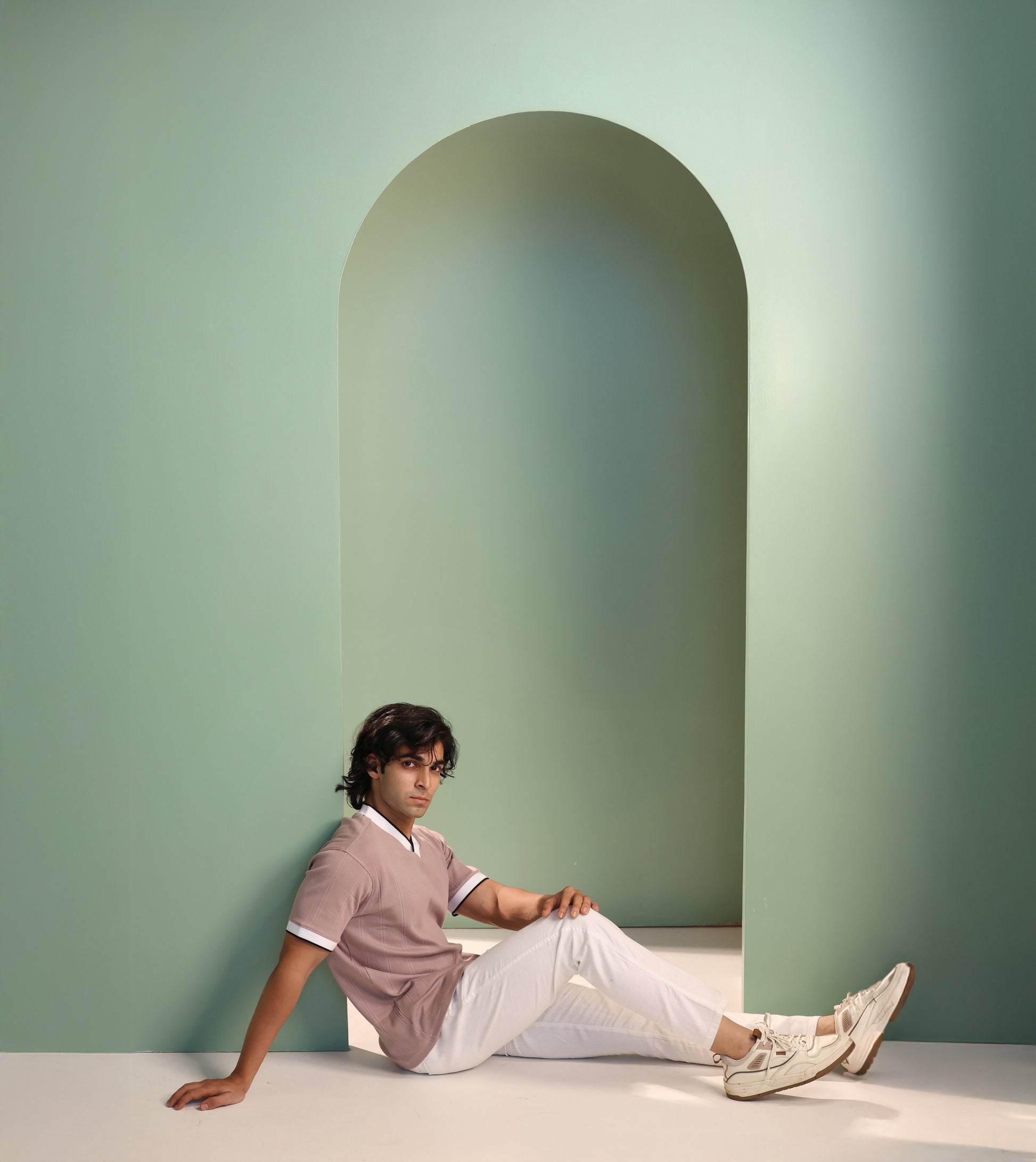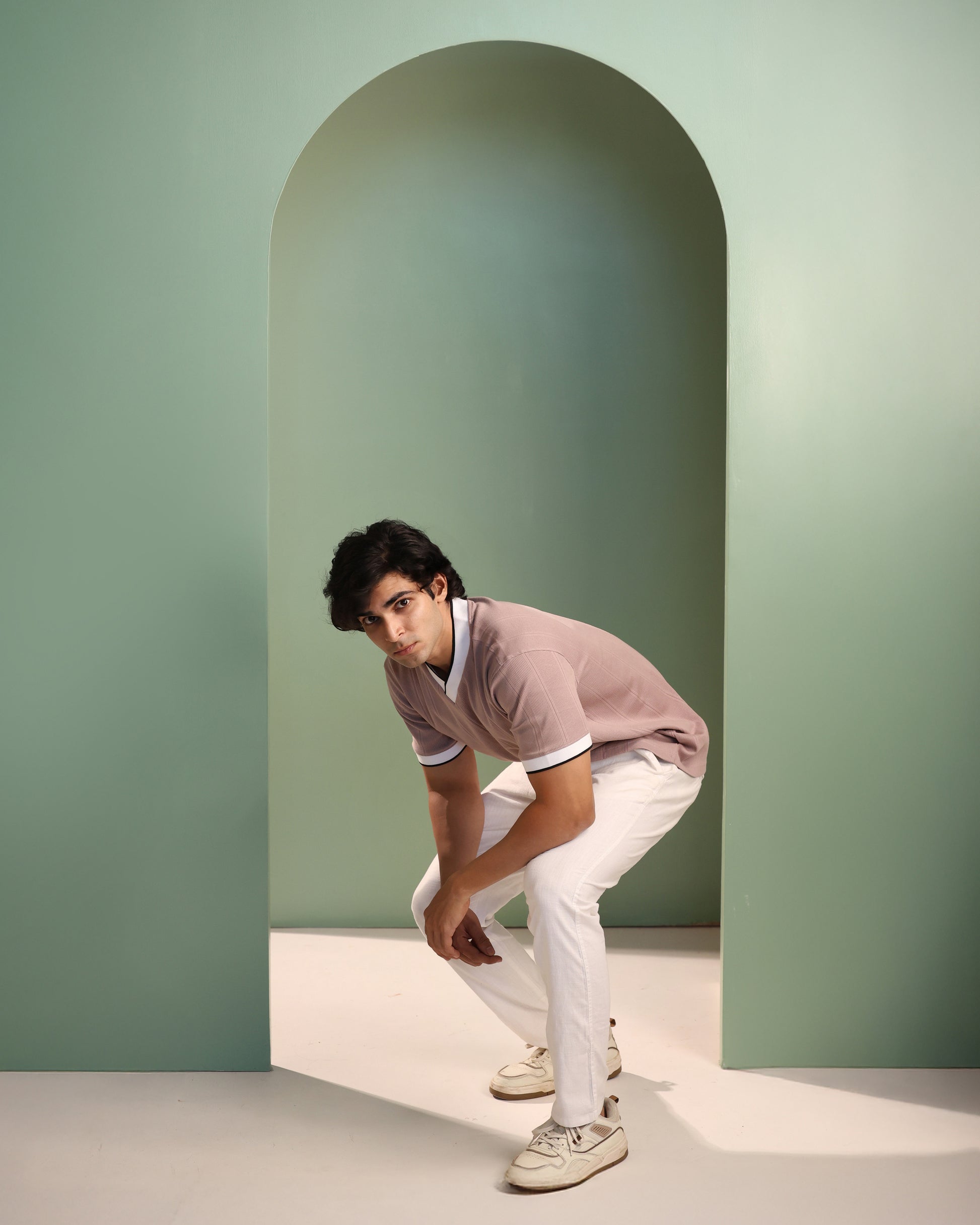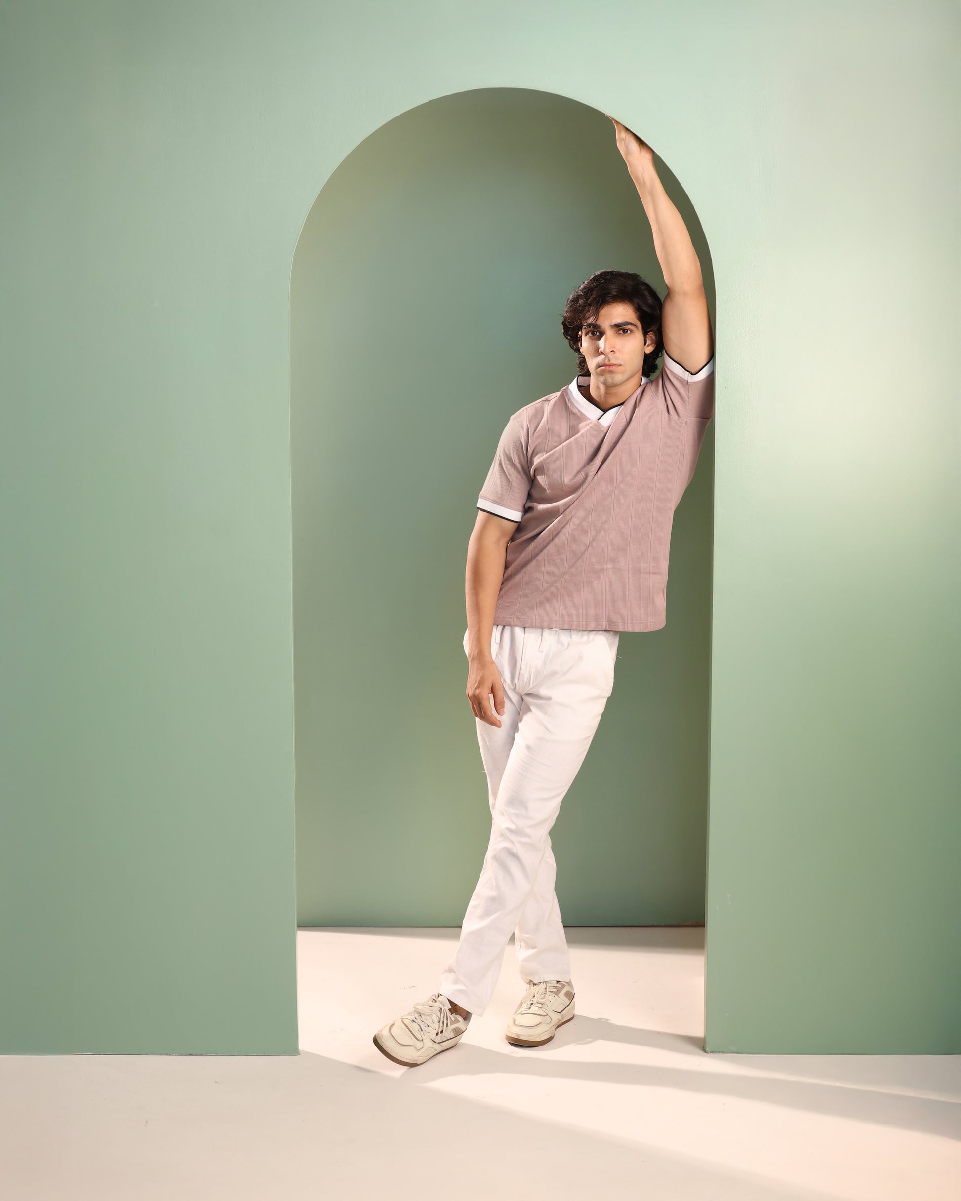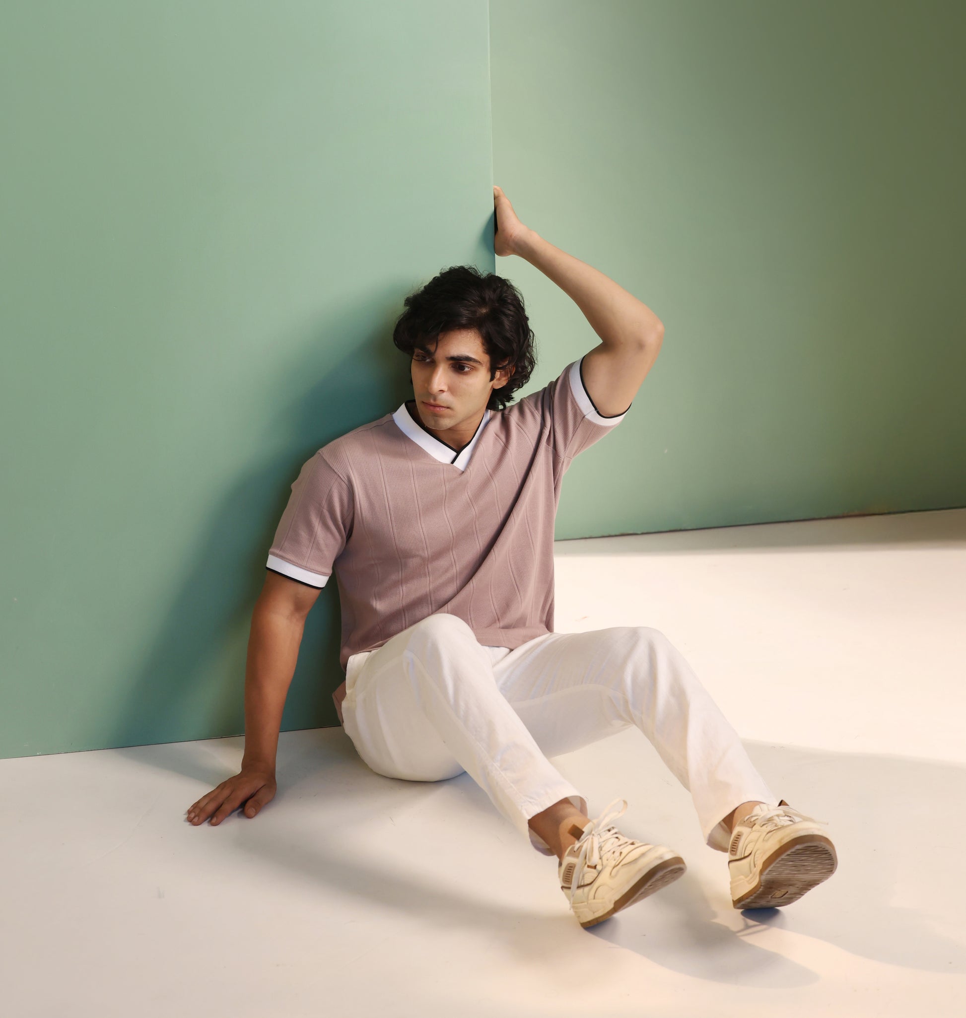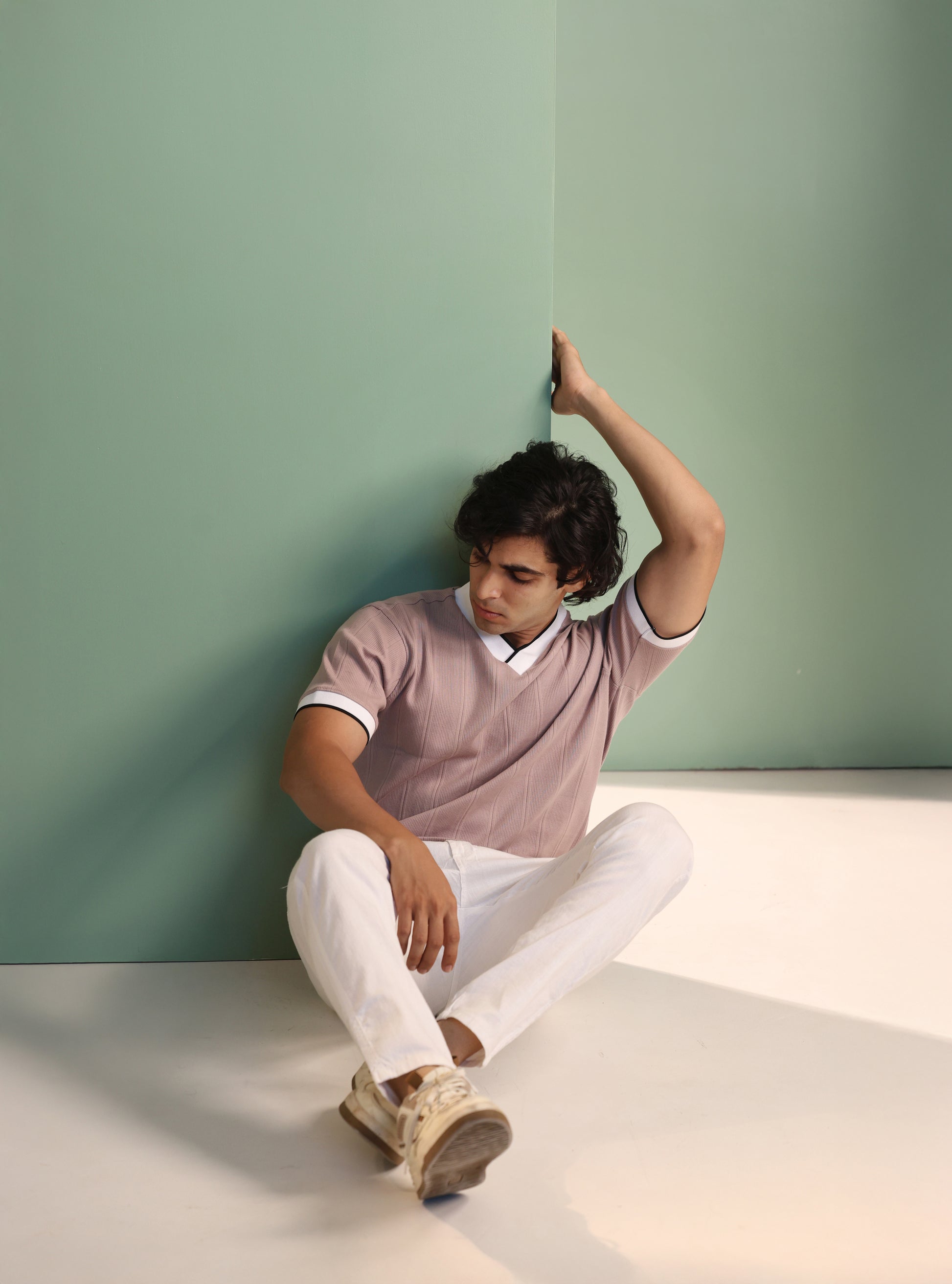 Indulge in luxury with our Contrast Piping Tee in Peach. Made with breathable jacquard knit fabric, this tee is not just stylish but also comfortable. The V neck detail in white adds a touch of sophistication. Experience the best of fashion and comfort with this exclusive piece.