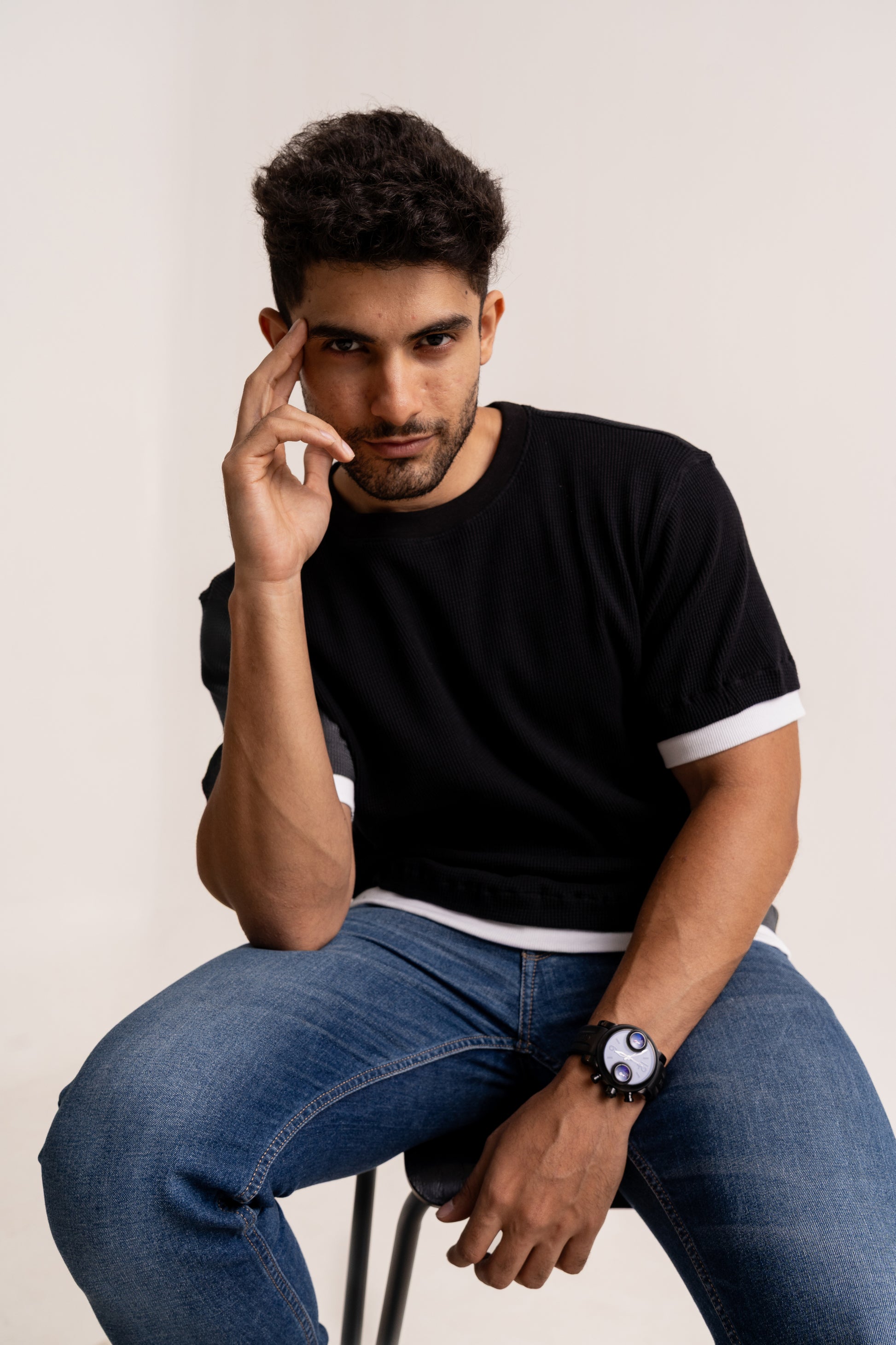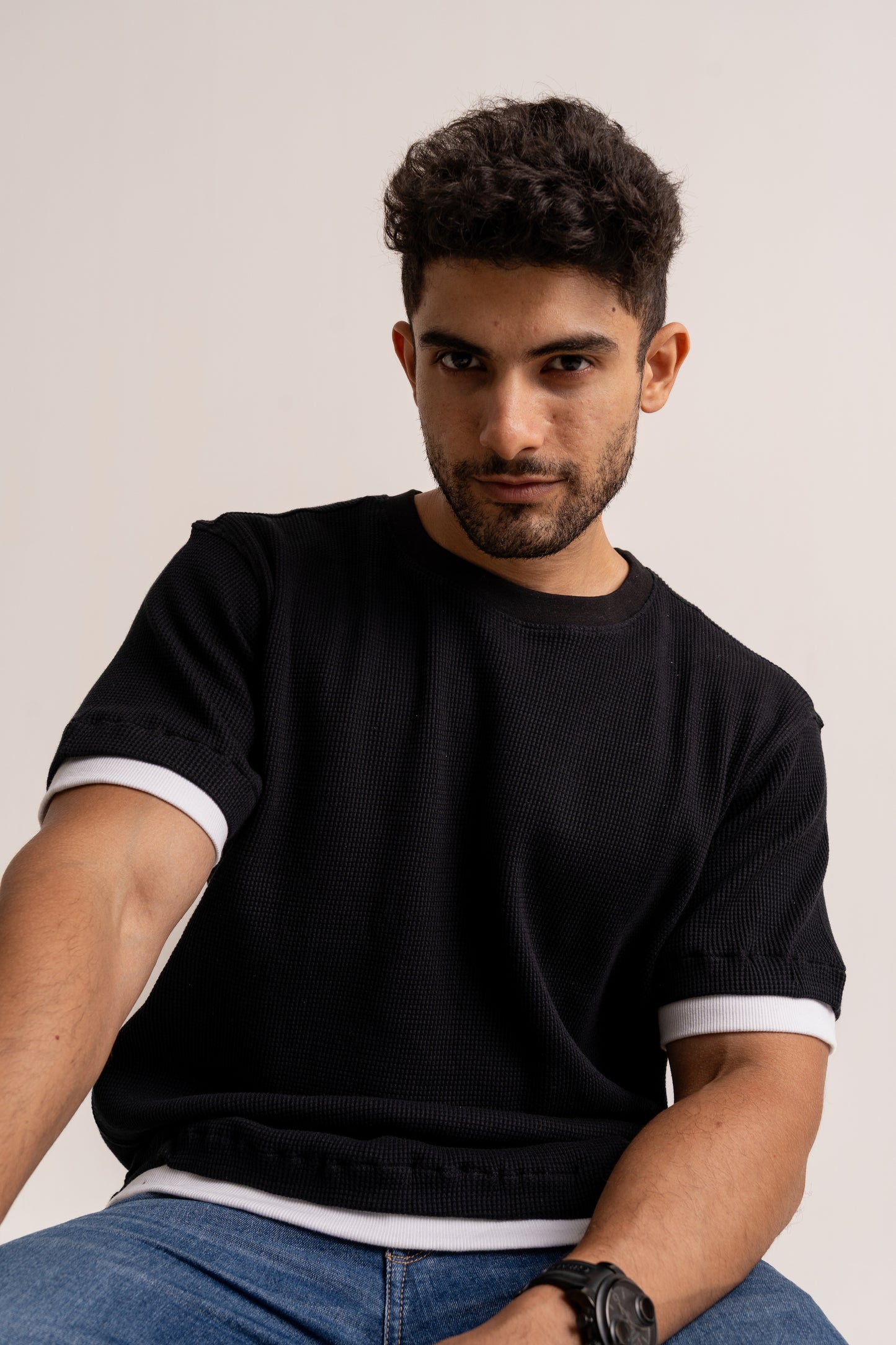 This black half-sleeve t-shirt features a refined mini solid checkered pattern, adding subtle texture to your wardrobe. Its crew neck is finished with a contrasting edge, lending a sharp, modern touch. Crafted for comfort and style, this tee pairs effortlessly with casual or smart-casual looks, making it a versatile essential.