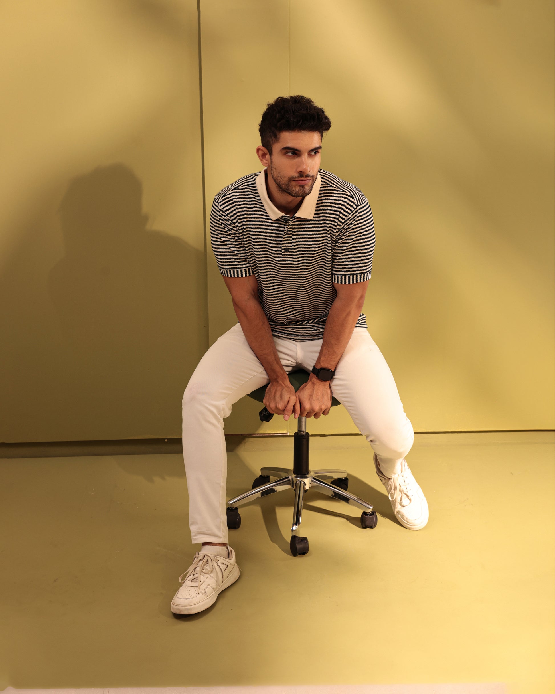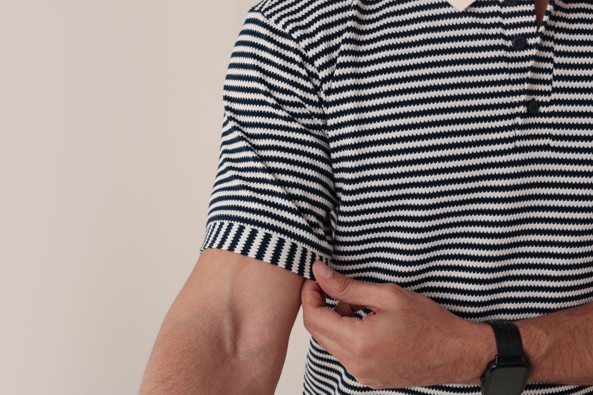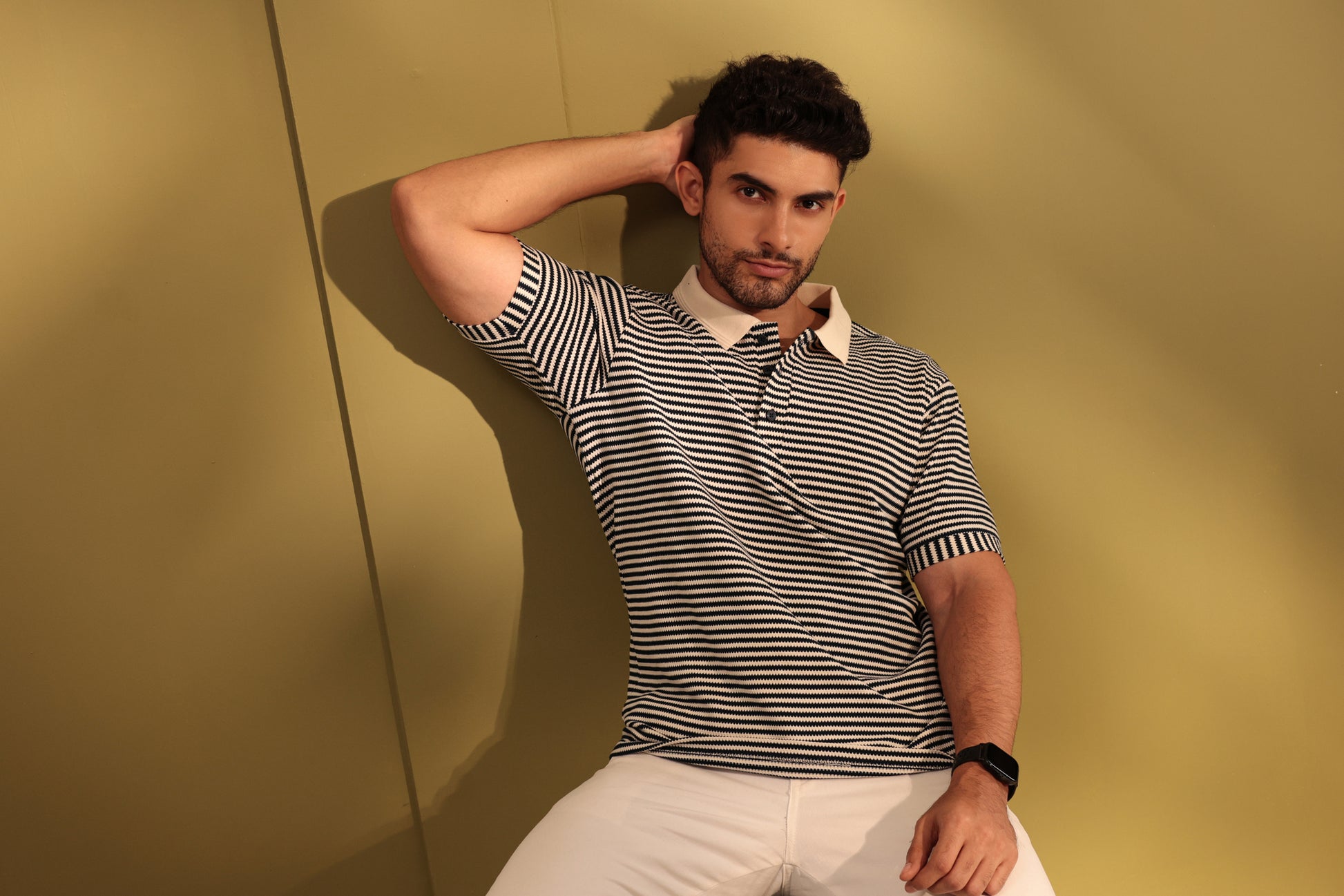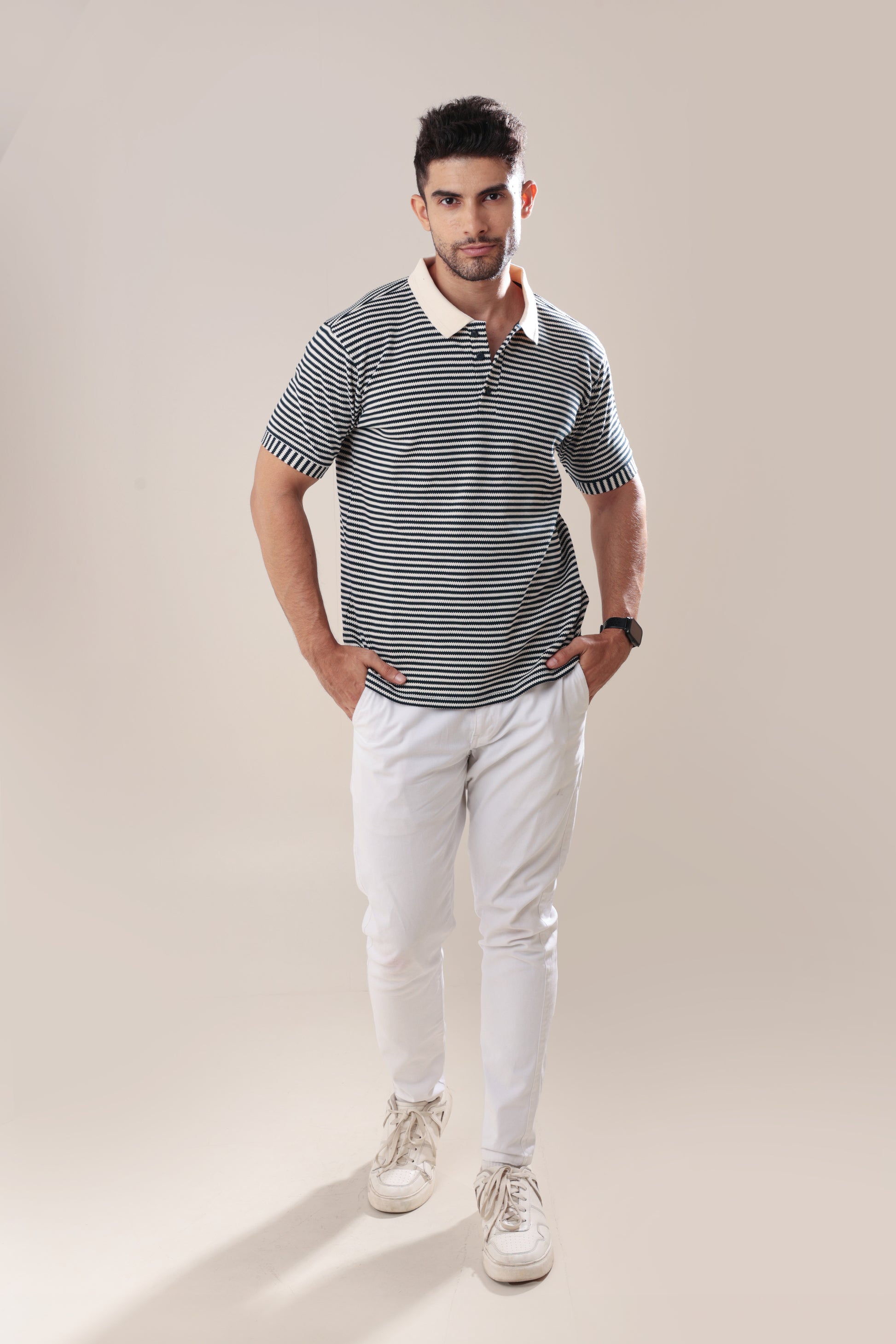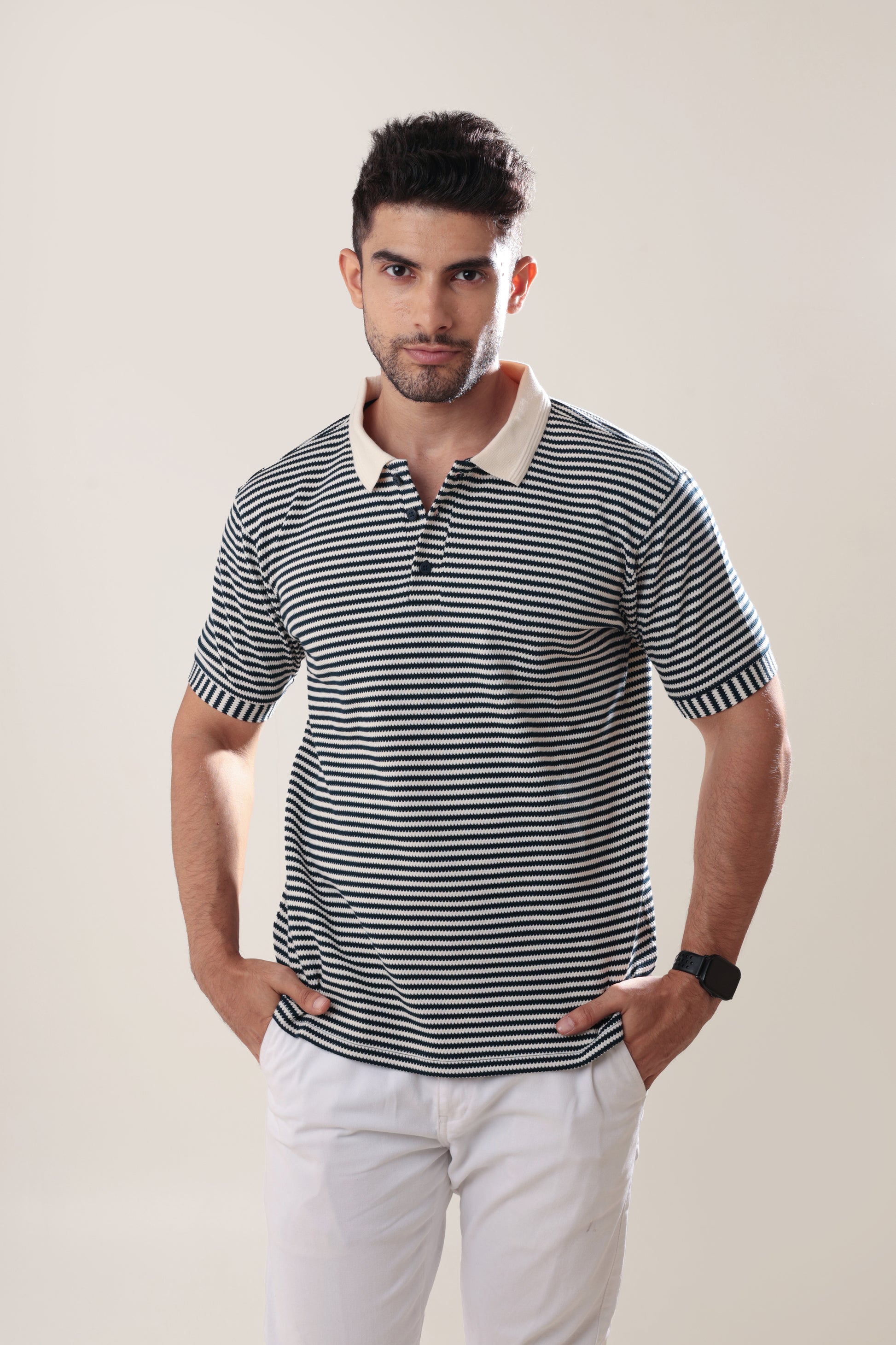 This stripe textured polo exudes summery sophistication, perfect for indulging in the finer moments of life. Experience the luxurious feel of the soft fabric against your skin while looking stylish and exclusive. Make a statement with this polo, a must-have for any fashion-forward individual.