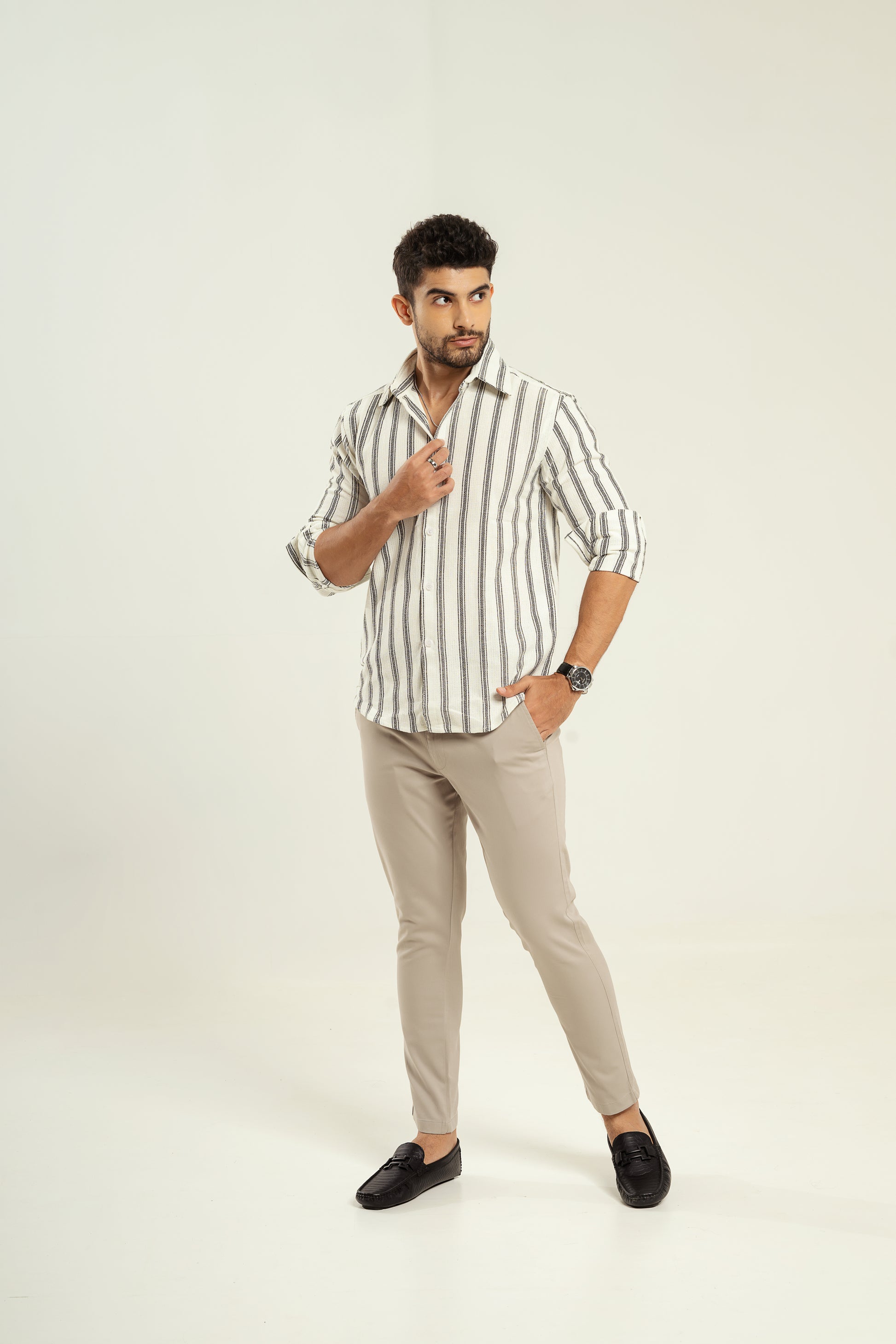 The striped textured shirt is a go-to for comfort and versatility. With an open fabric and coarser count, it readily adapts to seasonal changes - enjoying the breezy feel of summer and the cozy warmth of winter.