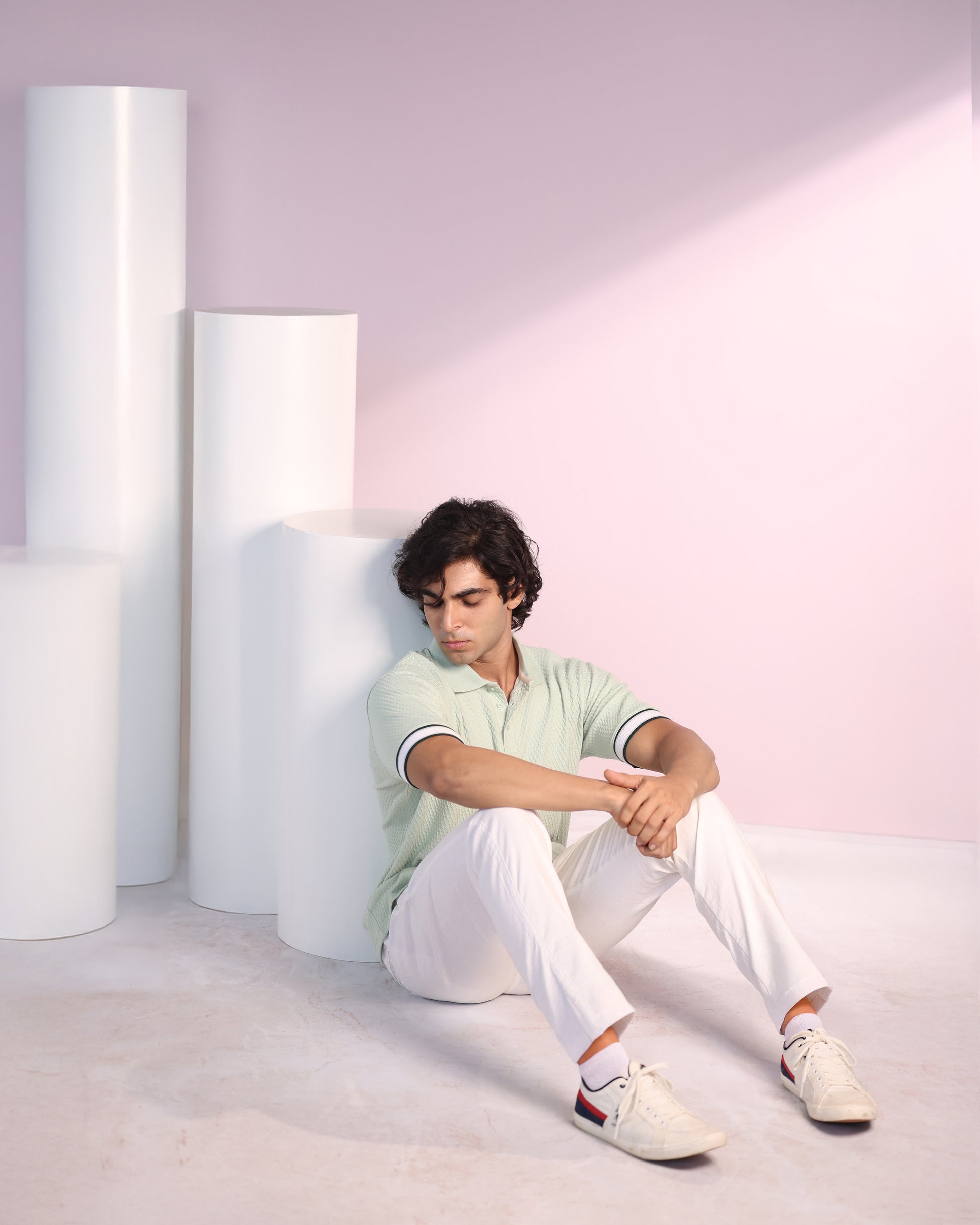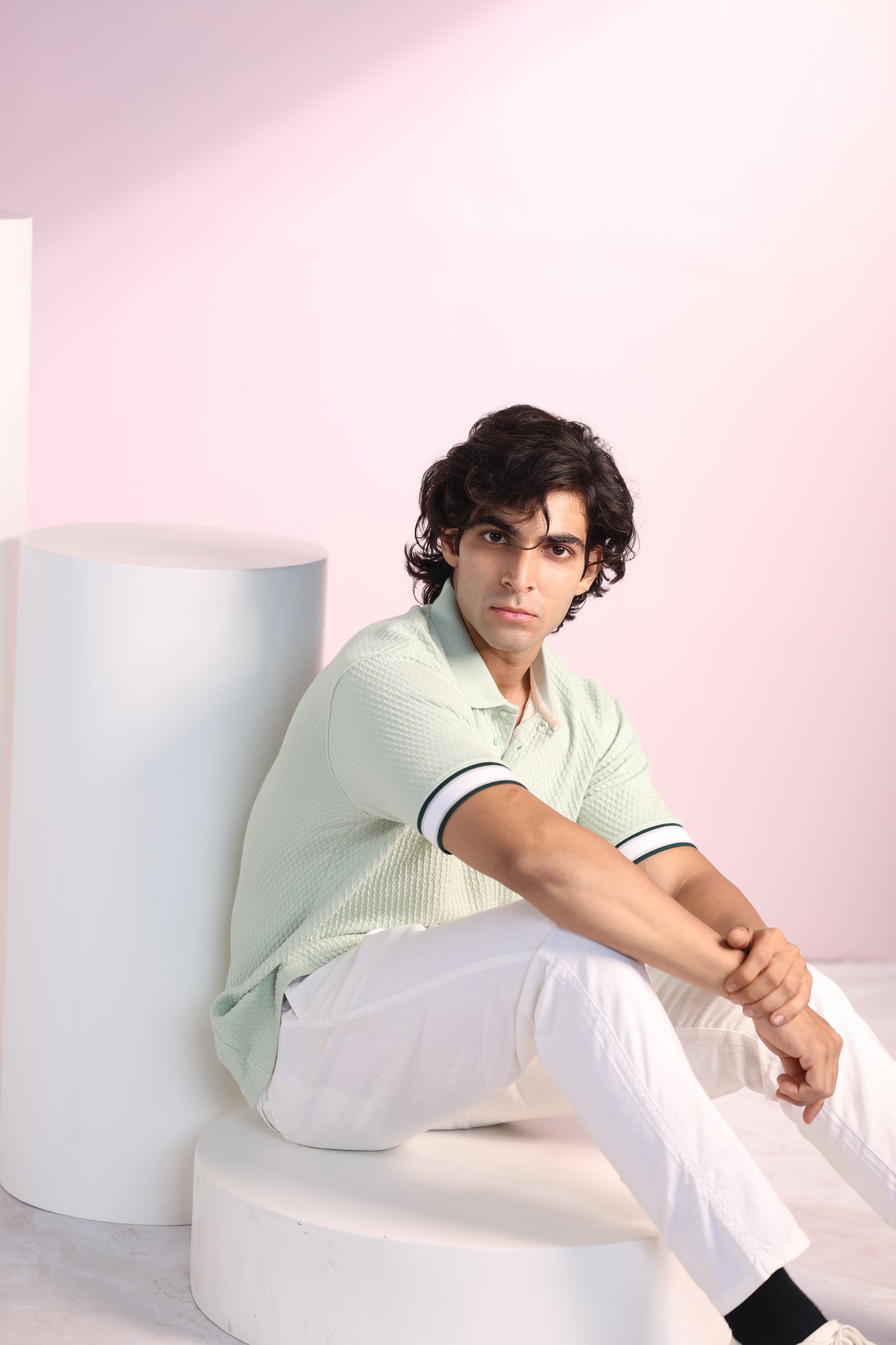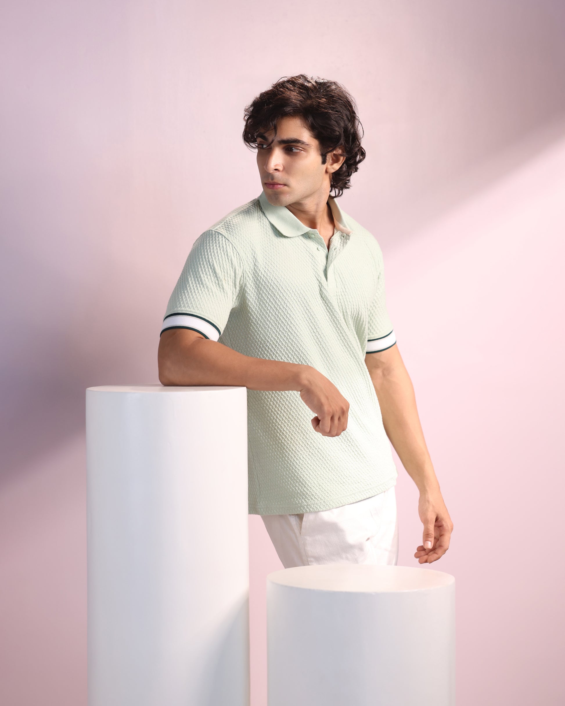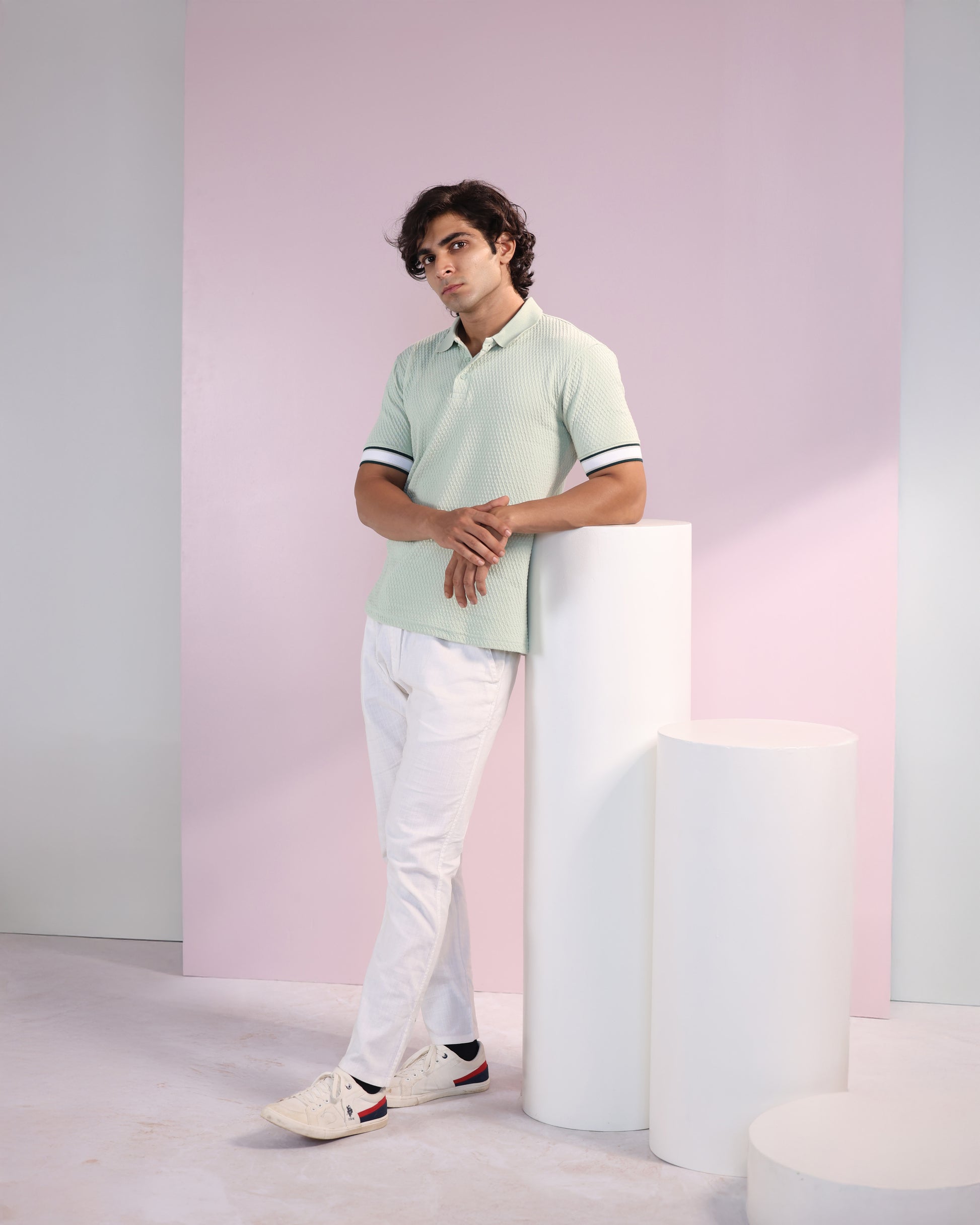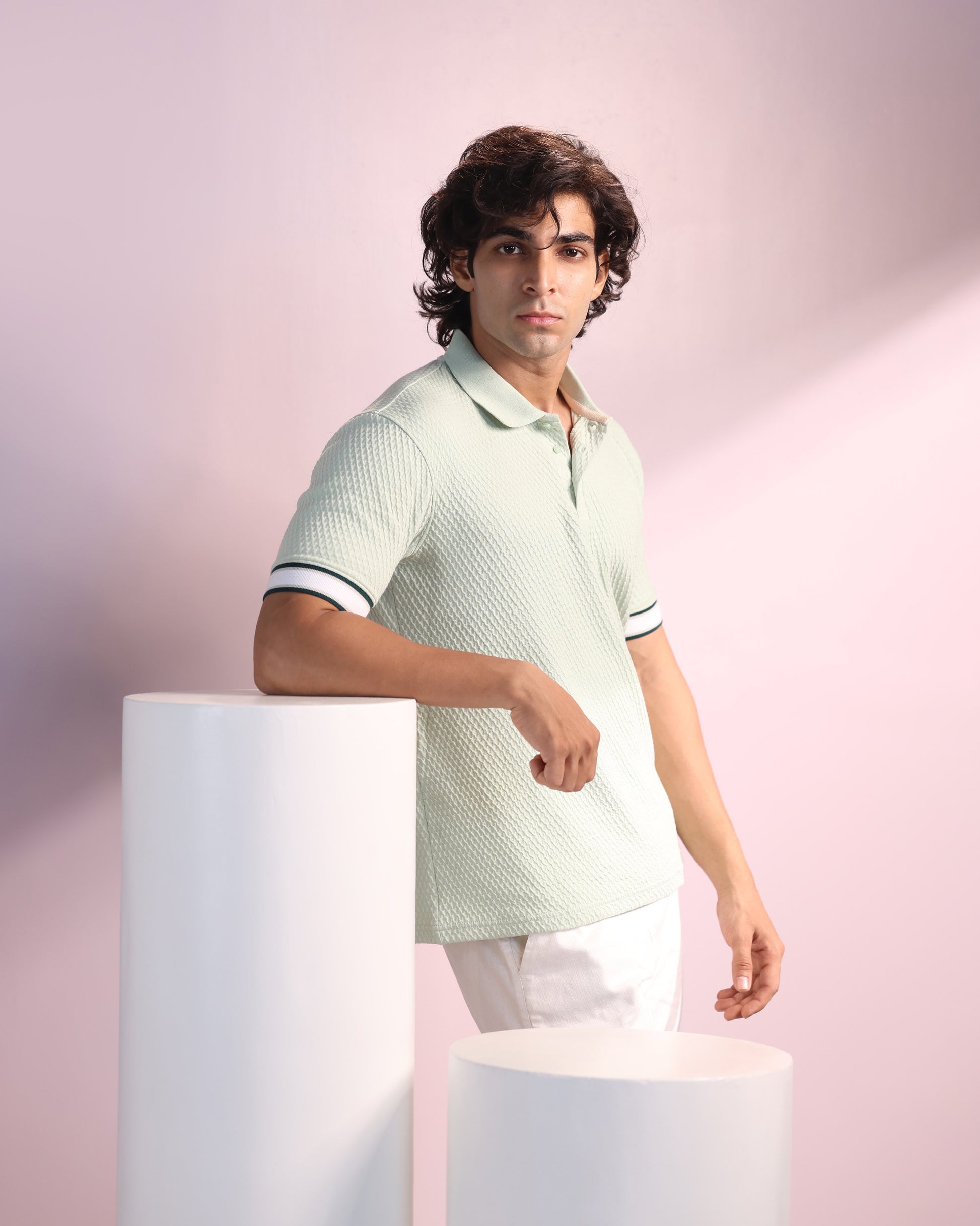 Step up your t-shirt game with our waffle textured tee in sage green. The distinct jacquard fabric provides superior breathability and comfort, ensuring you look and feel your best in any setting. Elevate your wardrobe with this must-have piece.